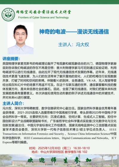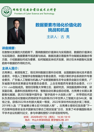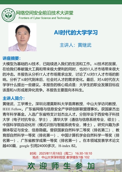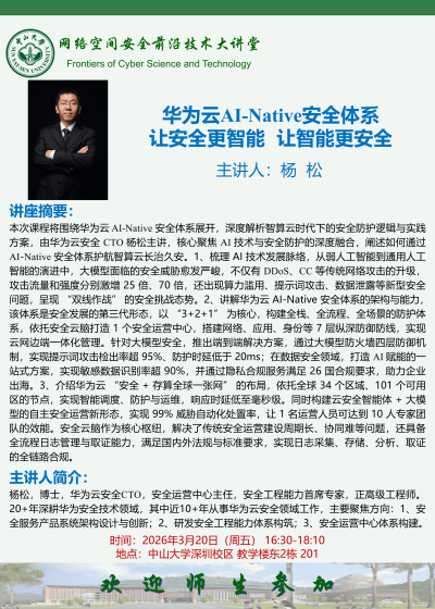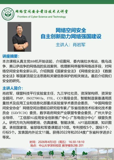 太阳成集团tyc9728足球队获中山大学2025年“逸仙杯”乙级联赛总冠军 2025年11月,太阳成集团tyc97282024级鸿网创新班正式开班 太阳成集团tyc97282025届毕业生合影留念 2023年4月,高松校长在我院调研 2024年2月,太阳成集团tyc9728召开学院高质量发展大会 学院新闻 2026-04-12 操晓春教授获评中国电子学会会士并为学会64周年寄语 2026-04-01 校企协同创新 | 沈力副教授获批CAAI-腾讯犀牛鸟研究计划项目 2026-03-27 2026海外优青 | 太阳成集团tyc9728诚邀全球青年学者依托申报 2026-03-27 服务西部发展 | 我院戴望辰副教授获批国网项目 2026-03-27 智汇光明 | CCF C³走进中山大学深圳校区 更多 12 2026-04 操晓春教授获评中国电子学会会士并为学会64周年寄语 01 2026-04 校企协同创新 | 沈力副教授获批CAAI-腾讯犀牛鸟研究计划项目 27 2026-03 2026海外优青 | 太阳成集团tyc9728诚邀全球青年学者依托申报 27 2026-03 服务西部发展 | 我院戴望辰副教授获批国网项目 27 2026-03 智汇光明 | CCF C³走进中山大学深圳校区 通知公告 学院通知 党建通知 人才培养 人才招聘 招生信息 27 2026-03 太阳成集团tyc97282026年硕士研究生招生复试递补拟录取名单(第一批) 24 2026-03 太阳成集团tyc97282026年硕士研究生招生复试结果 18 2026-03 太阳成集团tyc97282026年硕士研究生复试录取实施细则 06 2026-03 太阳成集团tyc9728开通“院长、书记信箱” 13 2026-01 太阳成集团tyc97282026年“申请-考核”制招收博士研究生调剂复试名单通知(第一批) 06 2026-01 太阳成集团tyc97282026年“申请-考核”制招收博士研究生调剂公告(第一批) 07 2026-04 太阳成集团tyc9728操晓春院长讲授思政第一课 06 2026-03 太阳成集团tyc9728开通“院长、书记信箱” 06 2026-03 太阳成集团tyc9728部署启动树立和践行正确政绩观学习教育 31 2025-12 太阳成集团tyc9728召开2025年度教职工大会暨工会会员大会 18 2025-12 我院王长磊老师荣获广东高校共青团团前教育说课比赛省级二等奖 13 2025-12 一堂党课,三万心声:中山大学2025年第三次党员集中大课再次掀起学习热潮 16 2025-09 太阳成集团tyc97282026年接收优秀应届本科毕业生推荐免试攻读研究生预报名通知(直博第二批) 16 2025-09 太阳成集团tyc97282026年接收优秀应届本科毕业生推荐免试攻读研究生预报名通知(直博第二批) 05 2025-08 太阳成集团tyc97282026年接收优秀应届本科毕业生推荐免试攻读研究生预报名通知 05 2025-08 太阳成集团tyc97282026年接收优秀应届本科毕业生推荐免试攻读研究生预报名通知 27 2026-03 2026海外优青 | 太阳成集团tyc9728诚邀全球青年学者依托申报 12 2026-03 太阳成集团tyc9728逸仙博士后项目全球招聘! 08 2025-12 中山大学第十六届国际青年学者论坛 太阳成集团tyc9728分论坛,诚盼您来! 11 2025-11 太阳成集团tyc9728人才见面会 | 新加坡站,诚邀您参加! 17 2025-03 太阳成集团tyc9728人才见面会 | 北京站,诚邀您参加 27 2026-03 太阳成集团tyc97282026年硕士研究生招生复试递补拟录取名单(第一批) 24 2026-03 太阳成集团tyc97282026年硕士研究生招生复试结果 18 2026-03 太阳成集团tyc97282026年硕士研究生复试录取实施细则 13 2026-01 太阳成集团tyc97282026年“申请-考核”制招收博士研究生调剂复试名单通知(第一批) 06 2026-01 太阳成集团tyc97282026年“申请-考核”制招收博士研究生调剂公告(第一批) 23 2025-10 太阳成集团tyc97282026年博士研究生招生简章 学术活动 【网络空间安全前沿技术大讲堂】数据要素市场化价值化的挑战和机遇 古亮 博士 东教学楼2-201 2026年04月17日 16:30 - 2026年04月17日 18:10 【网络空间安全前沿技术大讲堂】网络空间安全自主创新助力网络强国建设 肖岩军 中山大学深圳校区 东教学楼2-201 2026年04月03日 16:30 - 2026年04月03日 18:10 【网络空间安全前沿技术大讲堂】华为云AI-Native安全体系 杨松 博士 中山大学深圳校区 教学楼东2栋 201 2026年03月20日 16:30 - 2026年03月20日 18:10 【网络空间安全前沿技术大讲堂】神奇的电波——漫谈无线通信 冯大权 教授 中山大学深圳校区 教学楼东1栋 102 2025年12月30日 16:30 - 2025年12月30日 18:10 网安研途|本研身份转变系列讲座——独立科研探索 蒋彧琛 助理教授 中山大学深圳校区 工学园2栋 711 2025年12月24日 11:00 - 2025年12月24日 12:00 【网络空间安全前沿技术大讲堂】AI时代的大学学习 黄继武 教授 中山大学深圳校区 教学楼东1栋 102 2025年11月18日 16:30 - 2025年11月18日 18:10 更多