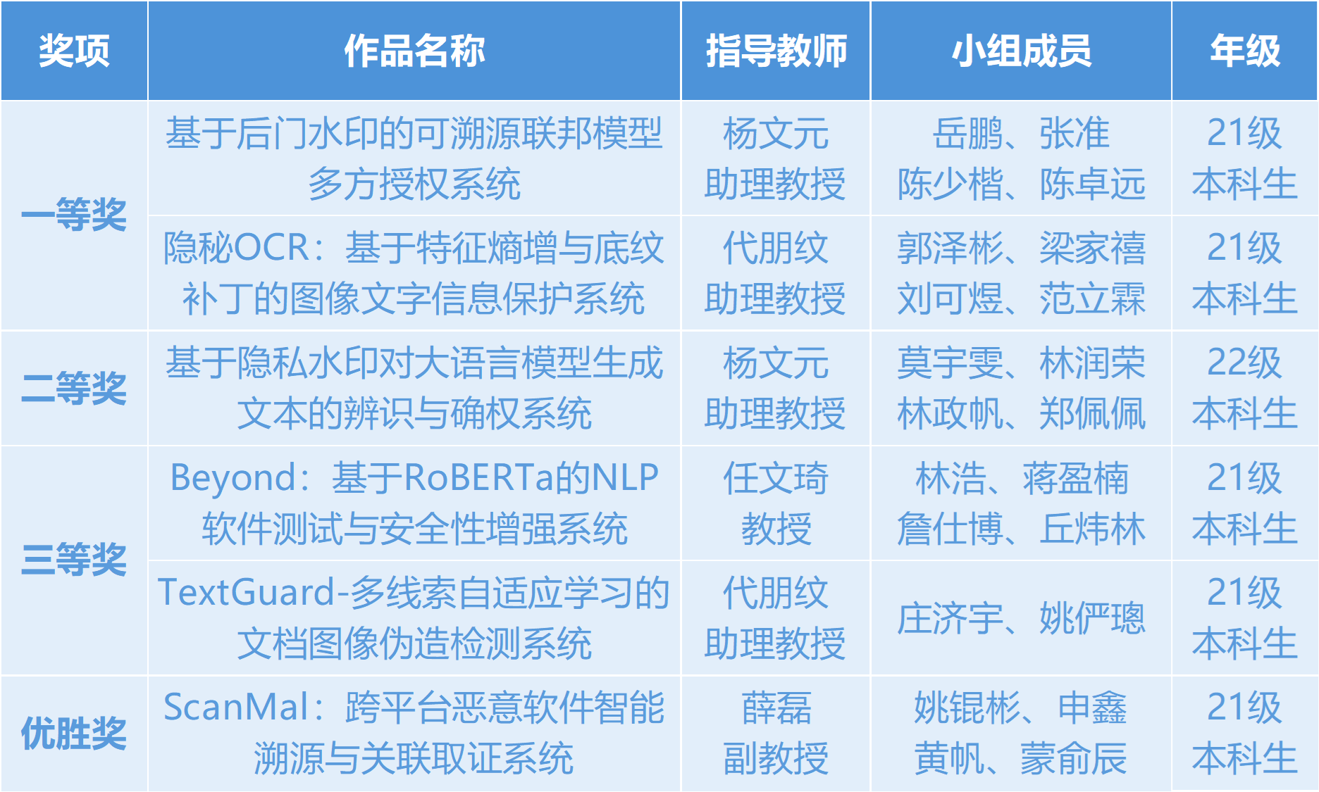 本届比赛的优秀成绩标志着太阳成集团tyc9728在学科赛事上的新突破,是对我院学生创新实践能力培养成效的肯定。学院将继续强化科研创新训练,鼓励更多学生参加学科竞赛,增强学生创新能力和学以致用的动手能力,持续提升学生的学习力、思想力、行动力,培养高水平的网络空间安全创新应用人才。