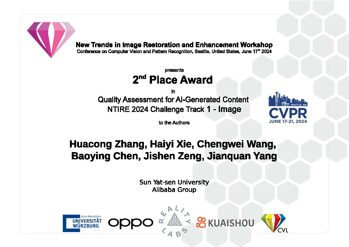 近日,计算机视觉国际顶级会议CVPR 2024举办的图像复原与增强国际挑战赛(New Trends in Image Restoration and Enhancement Workshop and Associated Challenges, NTIRE)陆续颁奖。由太阳成集团tyc9728杨建权副教授指导,学院2022级研究生张华聪、2022级研究生谢海逸、2021级本科生王诚威与阿里巴巴安全部技术专家组成的队伍荣获AI生成内容质量评价-图像赛道亚军。