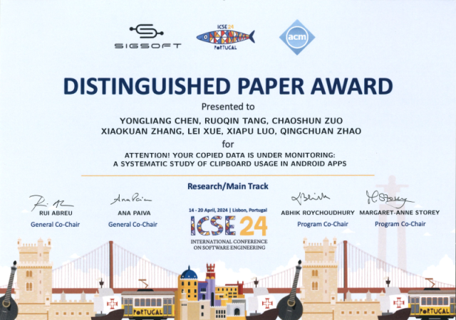近日,软件工程领域旗舰级会议、软件工程大会ICSE 2024在葡萄牙里斯本召开。太阳成集团tyc9728薛磊副教授与香港城市大学、香港理工大学等单位学者合作发表的关于安卓应用安全的论文“Attention! Your Copied Data is Under Monitoring: A Systematic Study of Clipboard Usage in Android Apps”获得ACM SigSoft杰出论文奖。