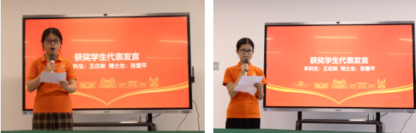 学生代表张爱平、王庄映发言,感谢学校的培养及奇安信的捐赠鼓励,表示将继续以这份荣誉为动力,不断追求进步,在学科领域中取得更好的成绩。