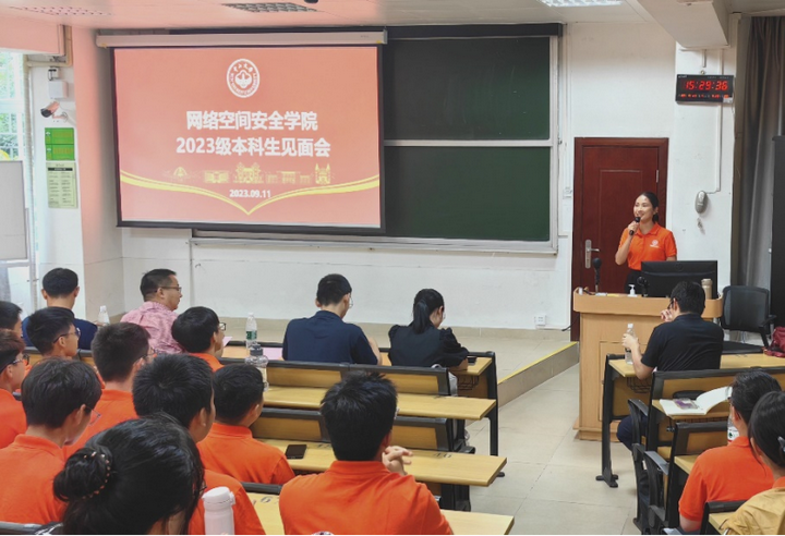 9月11日下午,太阳成集团tyc97282023级本科新生见面会在南校园第一教学楼1204顺利举办。学院院长操晓春教授、直属党支部书记卓义周、广西警察学院信息技术学院院长于小川教授、专任教师代表薛磊副教授、班主任杨文元老师、肖艳老师、马克思主义学院青年教师专职辅导员文净老师、党政专职辅导员王长磊老师、本科教务秘书徐静老师及2023级全体本科新生99人共同参加。会议由直属党支部副书记顾颖能主持。