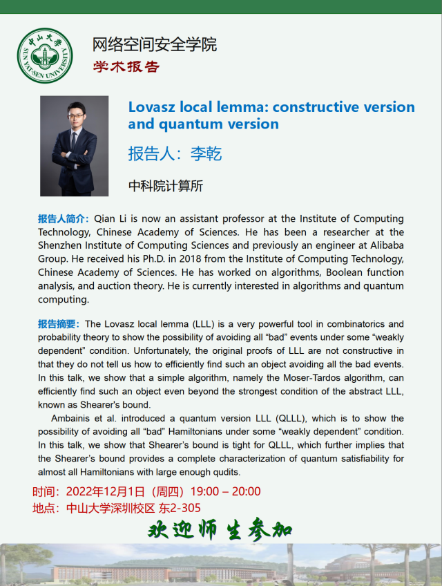 【学术报告】Lovasz local lemma: constructive version and quantum version