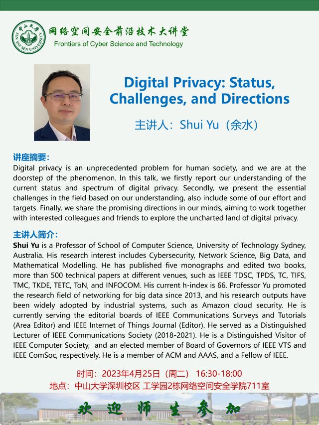 【学术讲座】Digital Privacy: Status,Challenges, and Directions